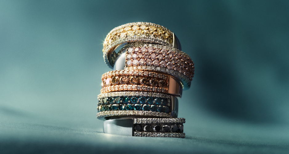 A stack of sparkling gemstone and diamond rings in gold, rose gold, and silver finishes on a blue background, with the text Best Sellers on the left.
