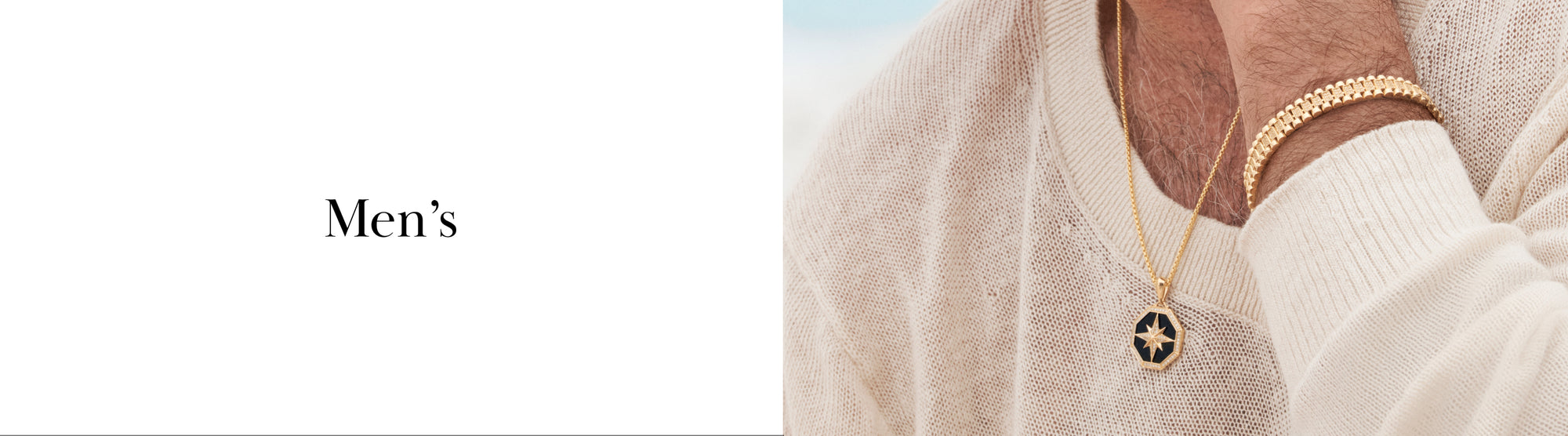 Fall Fashion For Him A man wearing a cream-colored sweater displays a gold bracelet and a gold necklace with a black and gold star pendant. Text on the left reads “Men’s.” The background is soft and neutral.