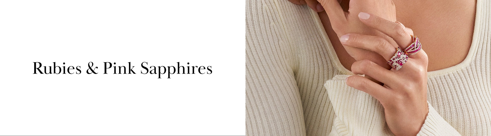 Pink Sapphire & Ruby A woman in a cream ribbed sweater displays her hand adorned with three elaborate rings featuring rubies and pink sapphires. The text Rubies & Pink Sapphires appears at the bottom of the image.