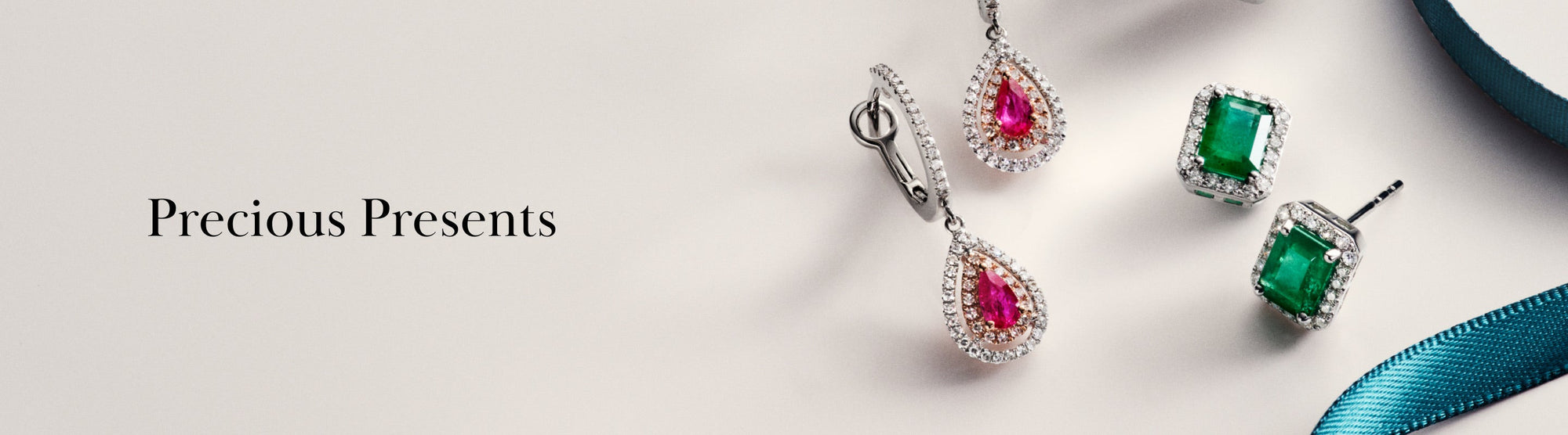 Precious Presents Elegant gemstone jewelry, including green and pink gemstone earrings surrounded by diamonds, and a pair of silver and blue gemstone earrings, is arranged beside a blue satin ribbon on a light background. Text reads “Precious Presents.”.
