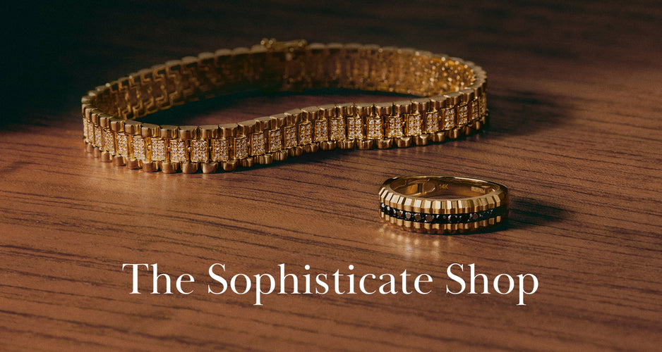 A gold bracelet and ring with intricate designs rest on a polished wooden surface next to the text “The Sophisticate Shop.”.