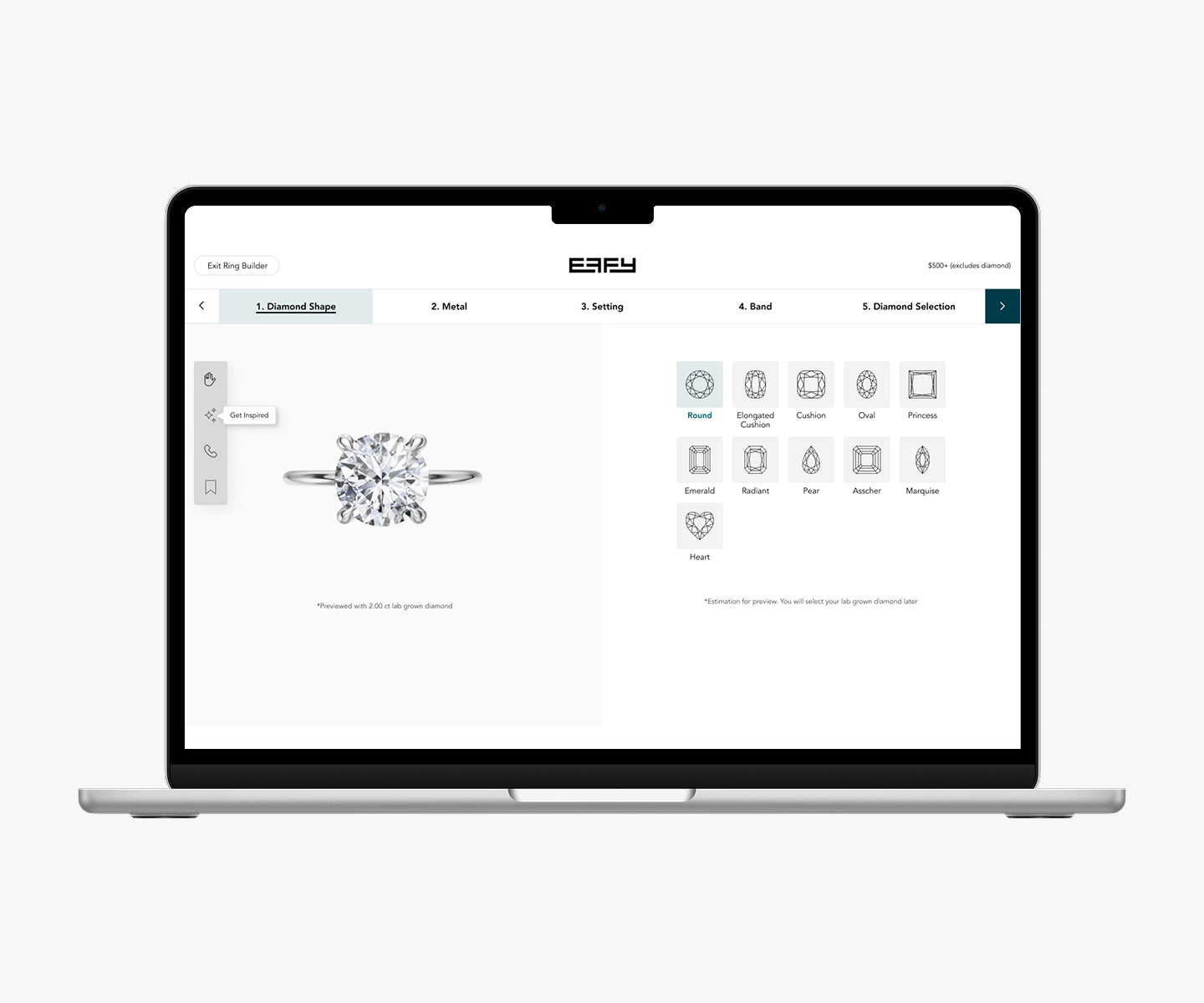 Play with settings, band shapes and metals and watch the rendering update live as you make your selection.